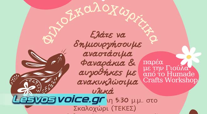 Η υπεύθυνη του Humade crafts workshop του Lesvos Solidarity, Γιούλα Κουτσούμπου διοργανώνει διήμερο παιδικών δραστηριοτήτων σε Σκαλοχώρι και Φίλια με τίτλο «Αναστάσιμα ΦιλιοΣκαλοχωρίτικα». Οι λιλιπούτειοι «μάστορες» θα έχουν την χαρά να δημιουργήσουν αναστάσιμα φαναράκια και πασχαλινές αυγοθήκες με ανακυκλώσιμα υλικά. Οι δράσεις θα πραγματοποιηθούν : · Σάββατο 8 Απριλίου στις 5:30 μ.μ. στο Σκαλοχώρι (ΤΕΚΕΣ) · Κυριακή 9 Απριλίου στις 11:00 π.μ. στη Φίλια (μετά την εκκλησία στην αίθουσα Καραγιαννόπουλου) Η είσοδος στις εκδηλώσεις θα είναι ελεύθερη. Οι μικροί κατασκευαστές θα πρέπει να έχουν μαζί τους ψαλίδι, πινέλο, λευκή κόλλα,…