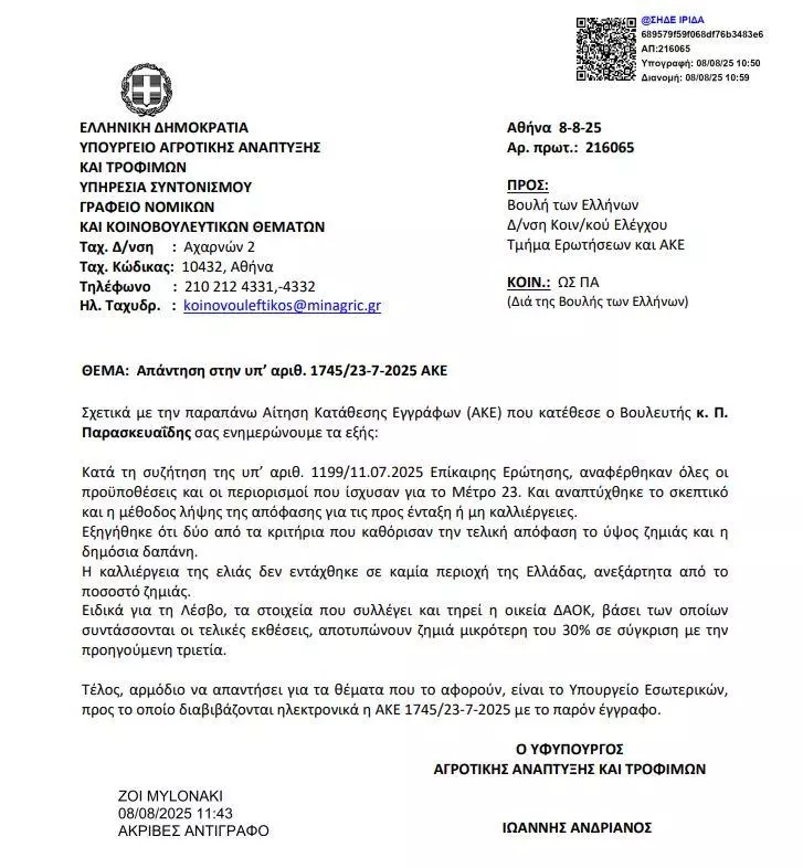 “Σχετικά με την παραπάνω Αίτηση Κατάθεσης Εγγράφων (ΑΚΕ) που κατέθεσε ο Βουλευτής κ. Π. Παρασκευαΐδης σας ενημερώνουμε τα εξής:Κατά τη συζήτηση της υπ’ αριθ. 1199/11.07.2025 Επίκαιρης Ερώτησης, αναφέρθηκαν όλες οι προϋποθέσεις και οι περιορισμοί που ίσχυσαν για το Μέτρο 23.Και αναπτύχθηκε το σκεπτικό και η μέθοδος λήψης της απόφασης για τις προς ένταξη ή μη καλλιέργειες.Εξηγήθηκε ότι δύο από τα κριτήρια που καθόρισαν την τελική απόφαση το ύψος ζημιάς και η δημόσια δαπάνη.Η καλλιέργεια της ελιάς δεν εντάχθηκε σε καμία περιοχή της Ελλάδας, ανεξάρτητα από το ποσοστό ζημιάς. Ειδικά για τη Λέσβο, τα στοιχεία που συλλέγει και τηρεί η οικεία ΔΑΟΚ, βάσει των οποίων συντάσσονται οι τελικές εκθέσεις, αποτυπώνουν ζημιά μικρότερη του 30% σε σύγκριση με την προηγούμενη τριετία. Τέλος, αρμόδιο να απαντήσει για τα θέματα που το αφορούν, είναι το Υπουργείο Εσωτερικών, προς το οποίο διαβιβάζονται ηλεκτρονικά η ΑΚΕ 1745/23-7-2025 με το παρόν έγγραφο.
