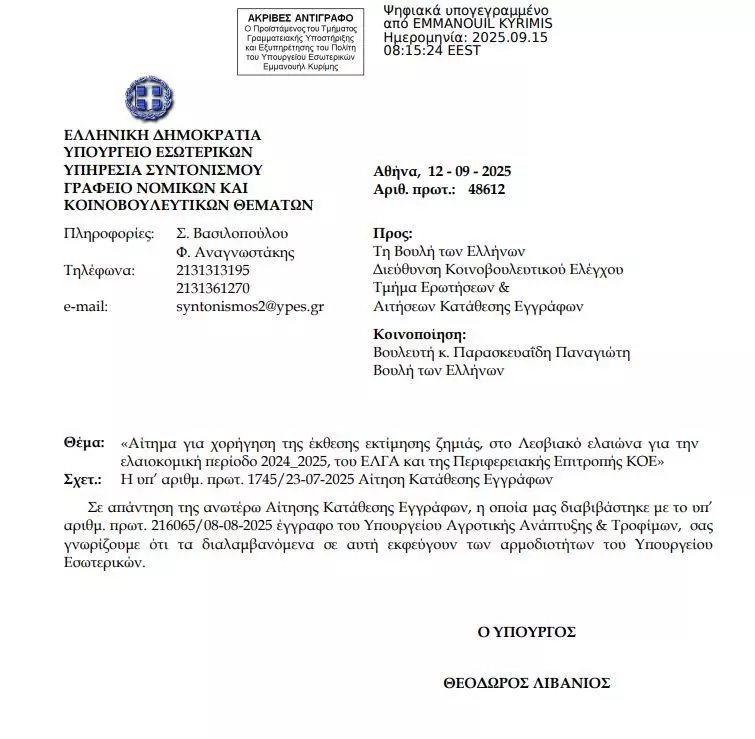 «Αίτημα για χορήγηση της έκθεσης εκτίμησης ζημιάς, στο Λεσβιακό ελαιώνα για την ελαιοκομική περίοδο 2024_2025, του ΕΛΓΑ και της Περιφερειακής Επιτροπής ΚΟΕ» Σχετ.: Η υπ’ αριθμ. πρωτ. 1745/23-07-2025 Αίτηση Κατάθεσης Εγγράφων Σε απάντηση της ανωτέρω Αίτησης Κατάθεσης Εγγράφων, η οποία μας διαβιβάστηκε με το υπ’ αριθμ. πρωτ. 216065/08-08-2025 έγγραφο του Υπουργείου Αγροτικής Ανάπτυξης & Τροφίμων, σας γνωρίζουμε ότι τα διαλαμβανόμενα σε αυτή εκφεύγουν των αρμοδιοτήτων του Υπουργείου Εσωτερικών. Ο ΥΠΟΥΡΓΟΣ ΕΣΩΤΕΡΙΚΩΝ ΘΕΟΔΩΡΟΣ ΛΙΒΑΝΙΟΣ