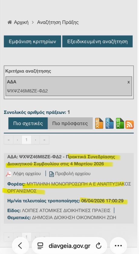 Χθες περί ώρα 17:00:29, μόλις δηλαδή 20 λεπτά μετά τη δημοσίευση μας για απευθείας ανάθεση υπηρεσίας γεύματος σε κατάστημα υγειονομικού ενδιαφέροντος ιδιοκτησίας του Αντιδήμαρχου Τουρισμού κ.Γιαννάκα, ο κ.Χριστόφας ως πρόεδρος της Αναπτυξιακής Εταιρείας του Δήμου Μυτιλήνης και ο κ. Αληγιάννης ως Διευθύνων Σύμβουλος, προχώρησαν σε μια πράξη που δεν αφήνει κανένα περιθώριο παρερμηνείας. Τροποποίησαν απόφαση που είχε ήδη αναρτηθεί στη «Διαύγεια», αφαιρώντας από το επίσημο πρακτικό την απευθείας ανάθεση ποσού 872 ευρώ προς τον Αντιδήμαρχο κ. Γιαννάκα.